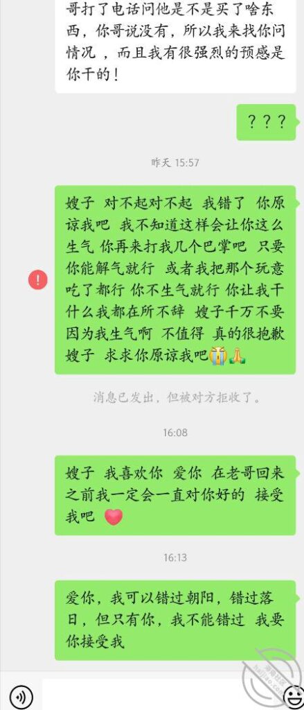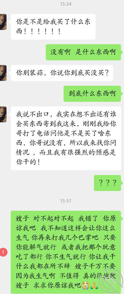 本来还打算过一会去她家门口偷听一下 结果还没十分钟我就收到了堂嫂的质问信息 我很害怕 不知道会发生什么 整个人都迷糊了 一会就听到了敲门声 我去开了门 预料之中的是堂嫂 她直接把那个东西连带快递盒丢了给我 说 这不是你买的嘛 你哥我刚刚问了 他没买 能东西给我的尤其是买这个东西的不会再有别人 这样除了你还是谁 我还在狡辩的说不是我买的 我堂嫂却直接要抢我手机打算看我的购物记录 我顿时慌了 握紧手机不敢松手 但这个行为不就是已经间接的承认了嘛