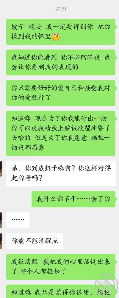 我过了好一会然后鼓足了勇气跟堂嫂说 “嫂子 我还喜欢你 你知道的 当年读书的时候我对你就充满爱意,后来你嫁给了我哥我是没办法才承认了我们没可能了 可是我哥常年不回家 我觉得你这样很辛苦 有时候会很可怜 我看的难受 所以我想暂替我哥来保护你爱你 可能我的做法不妥当 你也接受不了 可我见你这个样子我真的控制不了 嫂子你就让我在暗中默默的呵护你疼你爱你吧 ”