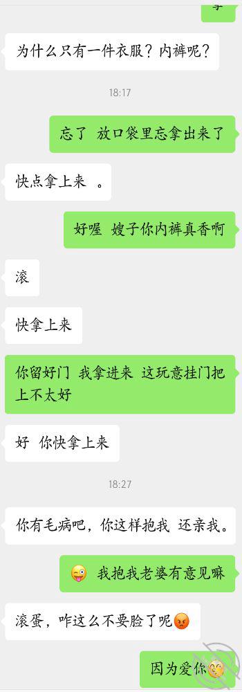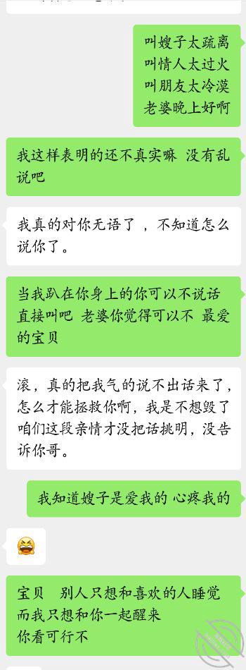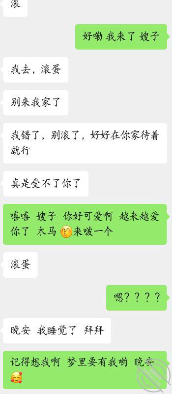 我无语 刚刚编辑好了的帖子因为app卡了导致帖子失踪真的来气,回归正题 兄弟们 上次我在网上学的一些情话这次派上用场了 堂嫂让我撩的态度都发生了转变 现在都顺其自然了 哈哈 有点莫名的开心 感觉自己的春天要来了 太爱我的嫂子了,今天晚上我本来是给堂嫂道晚安的然后再次表明我的心意爱意决意 本以为堂嫂那个点已经带着我的大侄子睡觉了 所以给她发了一些情话 谁曾想 她竟然没有睡还回复我了 这让我有点猝不及防