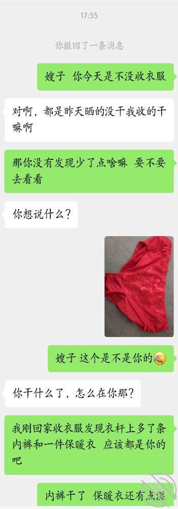 今天下午我忙完回家然后准备收衣服 居然发现我家的衣杆上有多余的衣服 一件灰色的保暖上衣和一条大红色的内裤 这一看就是堂嫂的 可能是今天风比较大给吹下来了,我拿着嫂子的内裤放在鼻子上使劲的闻 真特么太得劲了 真香啊 怦然心动啊 真是太爽了 我把这个事跟嫂子说了 但是心想着上天给了我一个这么好的机会我怎么可能不珍惜呢 于是我就拿着堂嫂的红内裤在厕所撸了一会 太爽了 太舒服了 冰冰的滑滑的 真让人脑热啊 但我没射 因为我怕嫂子会从此不理我