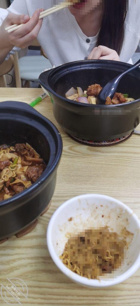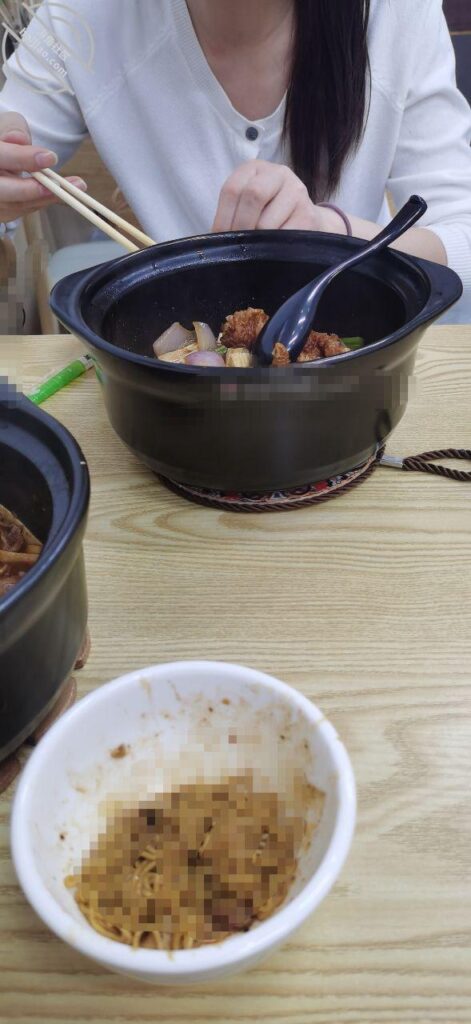 等女儿下班了,我看到她背着包出来,她也没怎么闹,看起来挺委屈的,让她回出租屋换了套衣服就带她吃鸡公煲了。